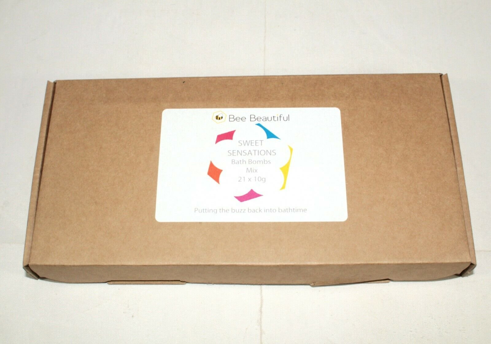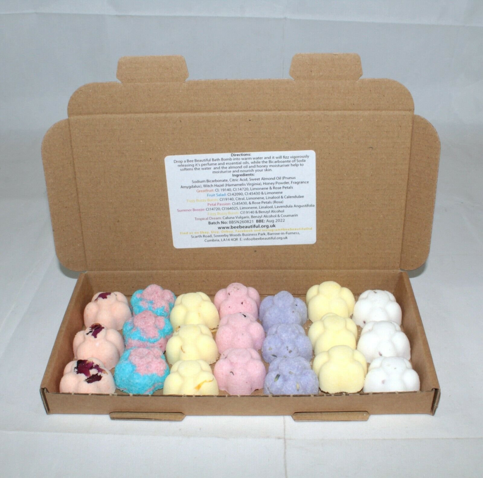 Each bath bomb is unwrapped and comes in a small cardboard box measuring 235mm x 115mm x 20mm