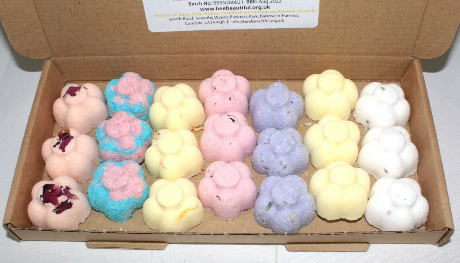 Our Sweet Sensations Bath Bomb box of 21 x 10g flower-shaped bath bombs. Which are a range of different scents and colours.