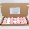 Each bath bomb is handmade and comes unwrapped in a small cardboard box measuring 235mm x 115mm x 20mm