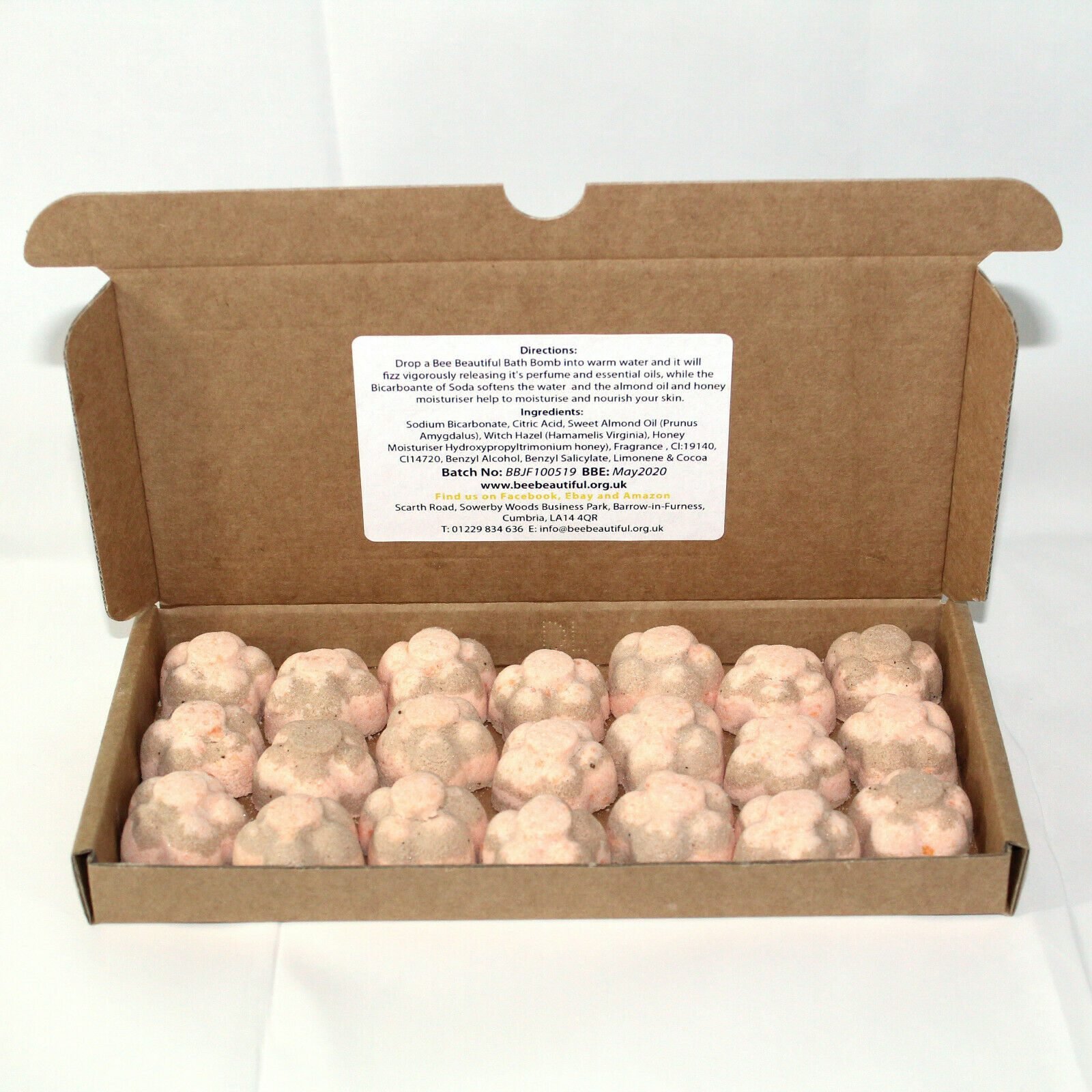 Each bath bomb is unwrapped and come in a small cardboard box measuring 235mm x 115mm x 20mm