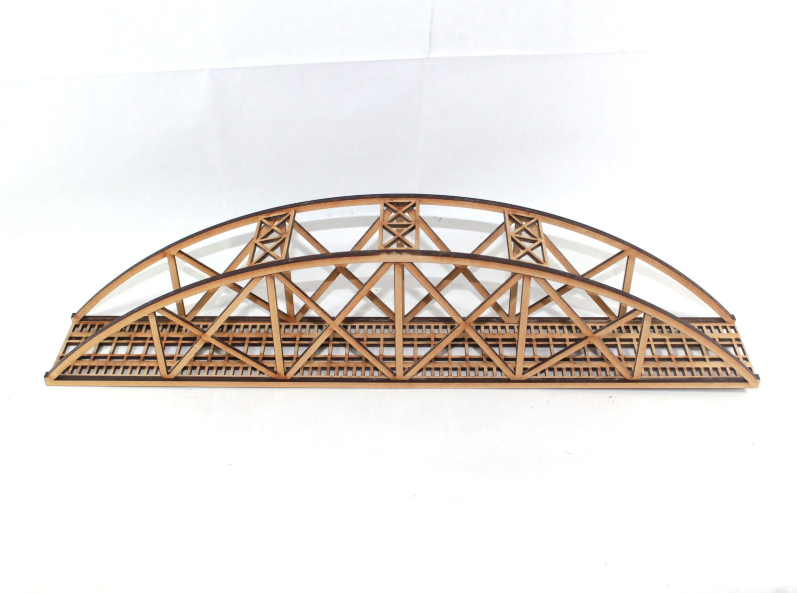 Laser cut OO gauge Bowstring bridge cut from 3mm MDF. Comes pre constructed ready to be painted and installed out of the box. Dimensions: 570mm length x 110mm width x 130mm height.