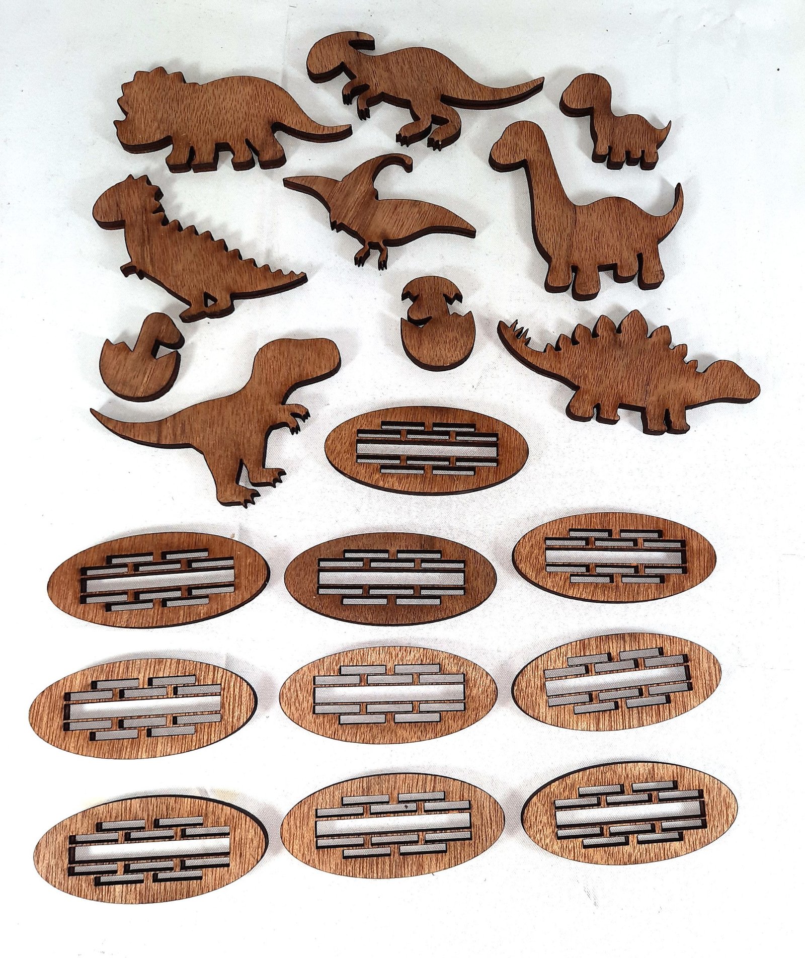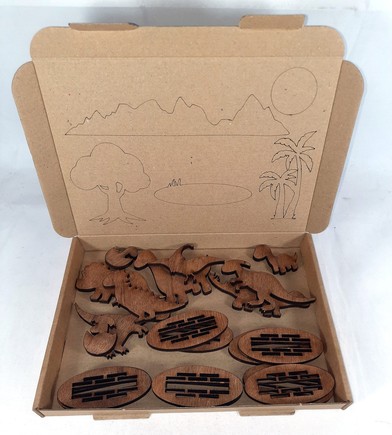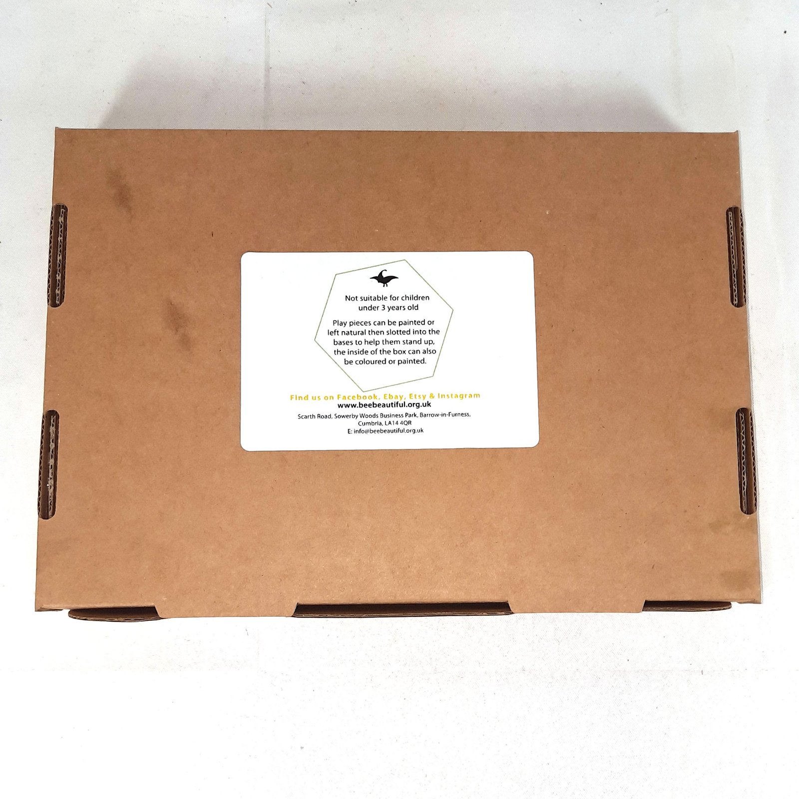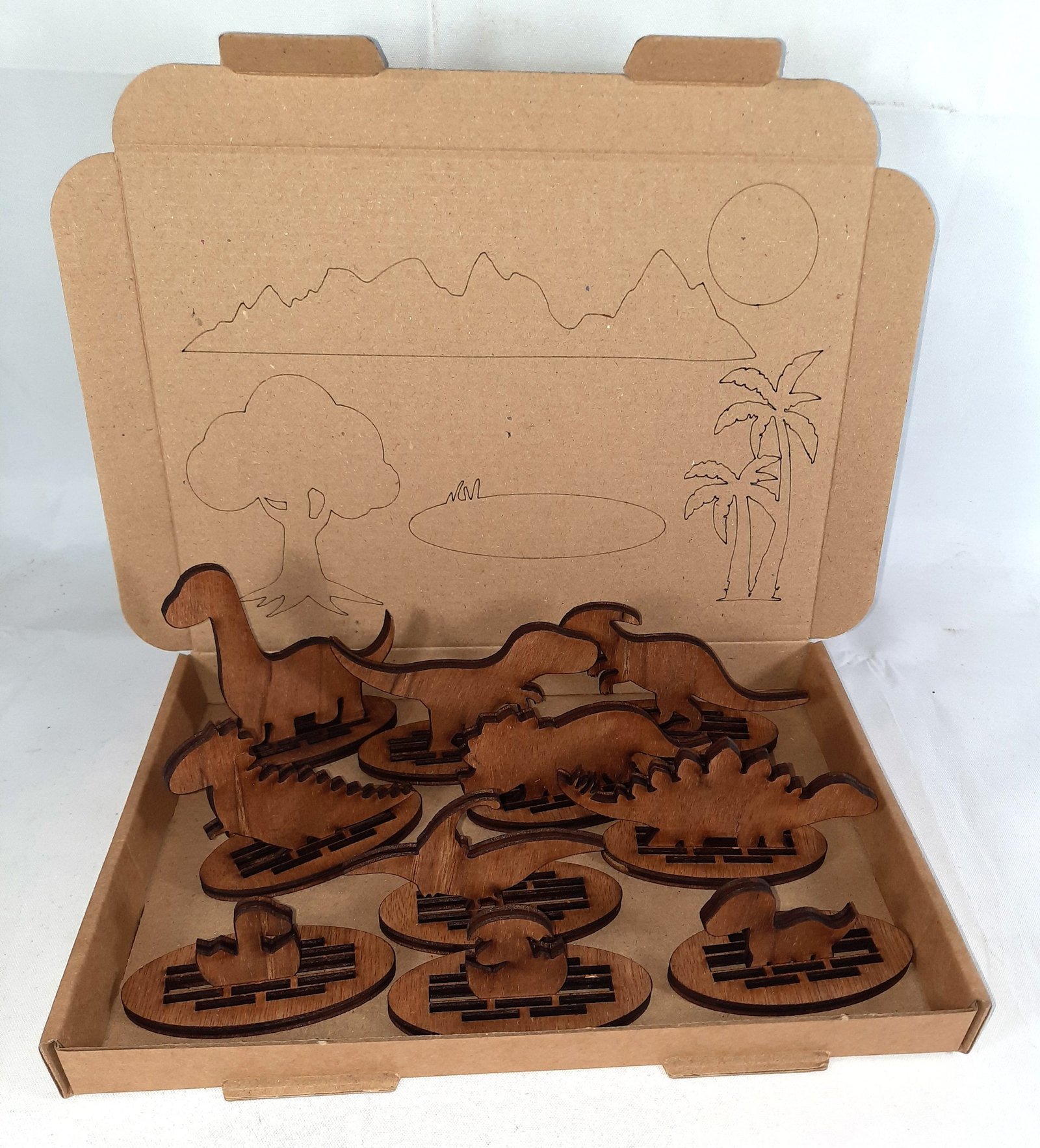 This dinosaur play set is great for children’s imaginary play and each dinosaur can be stood up in a stand they will arrive flat packed in the box which has a scene printed on the inside of the box which can also be coloured or painted. Each dinosaur measures approximately 60mm high and is cut from a 5mm plywood.